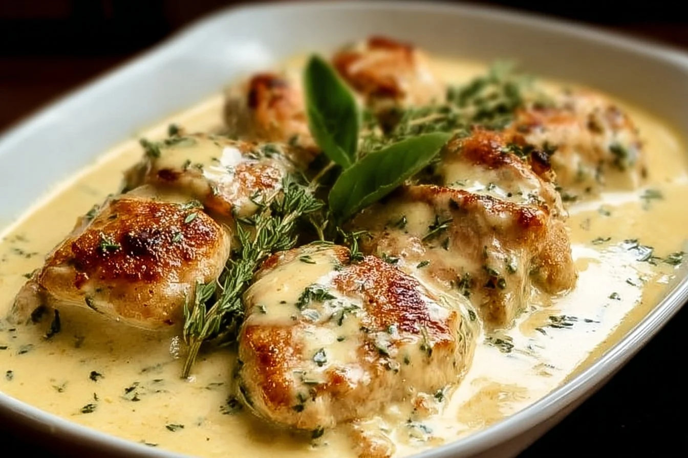 A creamy, indulgent dish featuring seared chicken breasts in a luscious Asiago cheese sauce, perfect for cozy dinners.