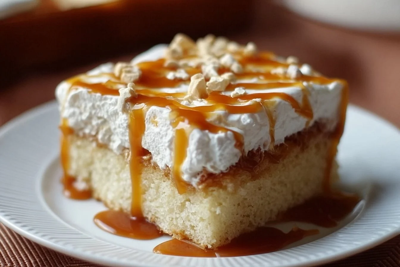 - Once the cake has absorbed the milk mixture, spread the whipped cream over the top. Finish by drizzling with caramel sauce.