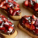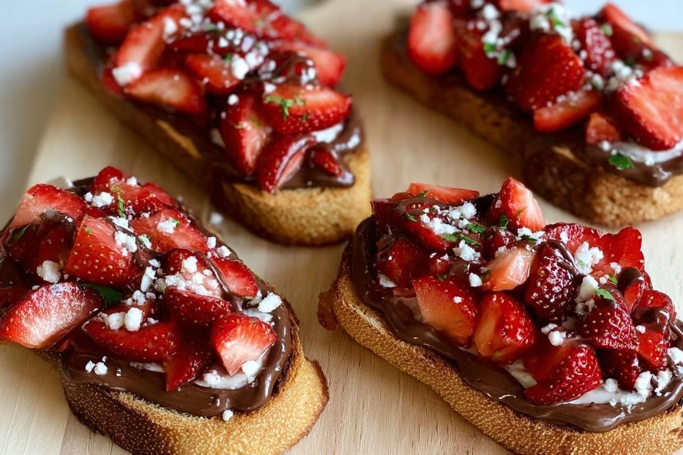 A delicious and easy-to-make chocolate and strawberry bruschetta topped with a creamy Nutella mixture.