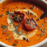 A warm, comforting bowl of creamy roasted garlic tomato soup, perfect for chilly evenings and easy weeknight meals.
