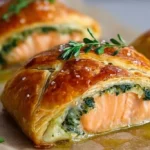 An impressive dish featuring flaky puff pastry enveloping seasoned salmon and a creamy spinach filling, perfect for any special occasion.
