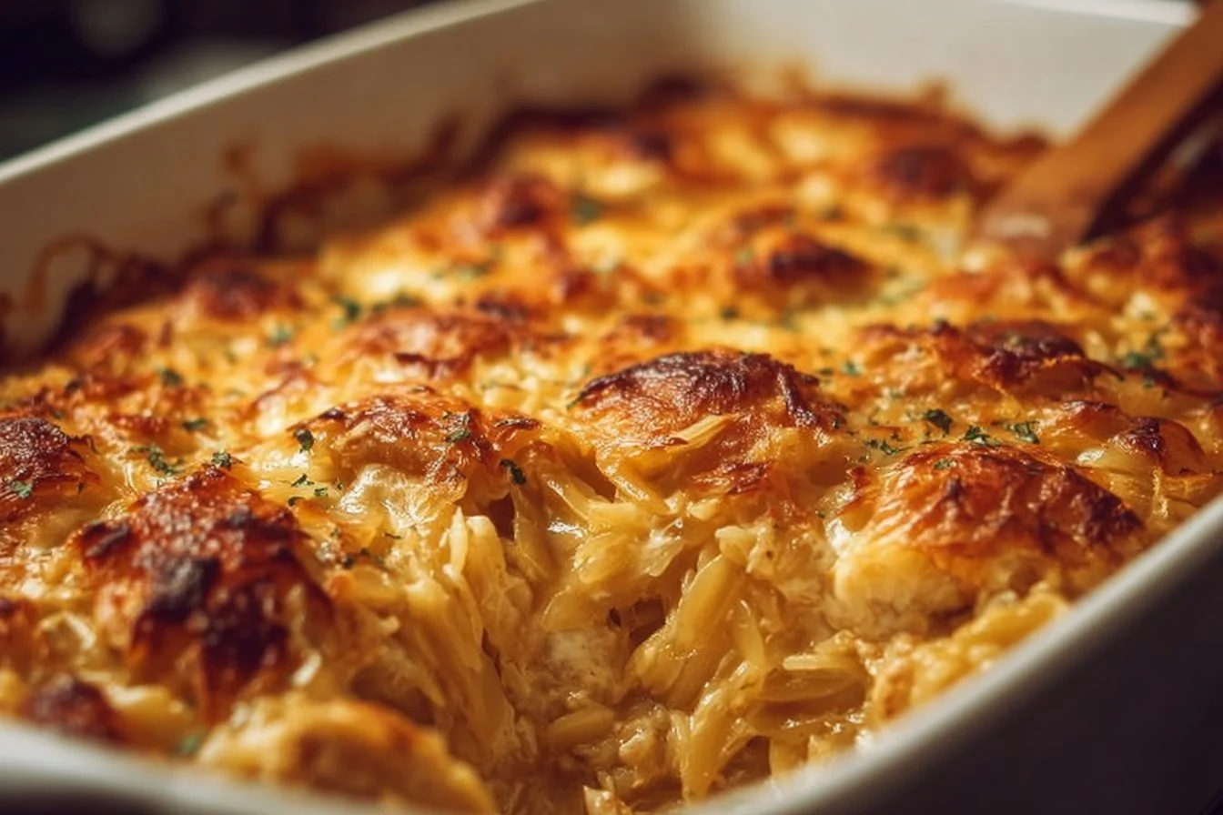 A comforting casserole blending the rich flavors of French onion soup with creamy chicken and orzo.