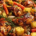A vibrant dish pairing juicy chicken with fresh pineapple and colorful peppers, offering a delightful mix of sweet and savory flavors.