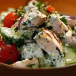 A refreshing and nutritious chicken salad featuring a creamy tzatziki dressing made with Greek yogurt and fresh vegetables, perfect for lunch or gatherings.