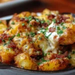 Delicious crispy potato wedges topped with gooey cheese, savory bacon, and creamy sour cream—a must-try twist on classic nachos.