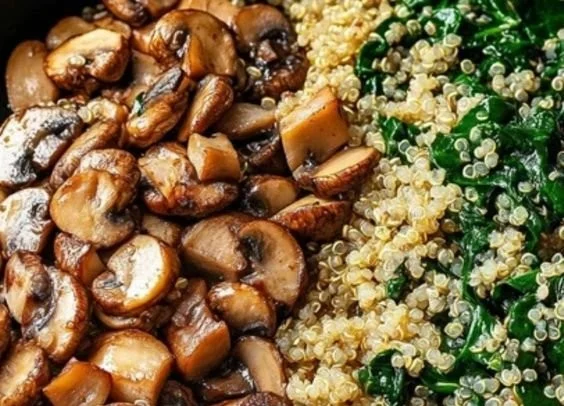 A vibrant and nutritious one-pan meal combining earthy mushrooms, fresh spinach, and nutty quinoa, perfect for a quick weeknight dinner.