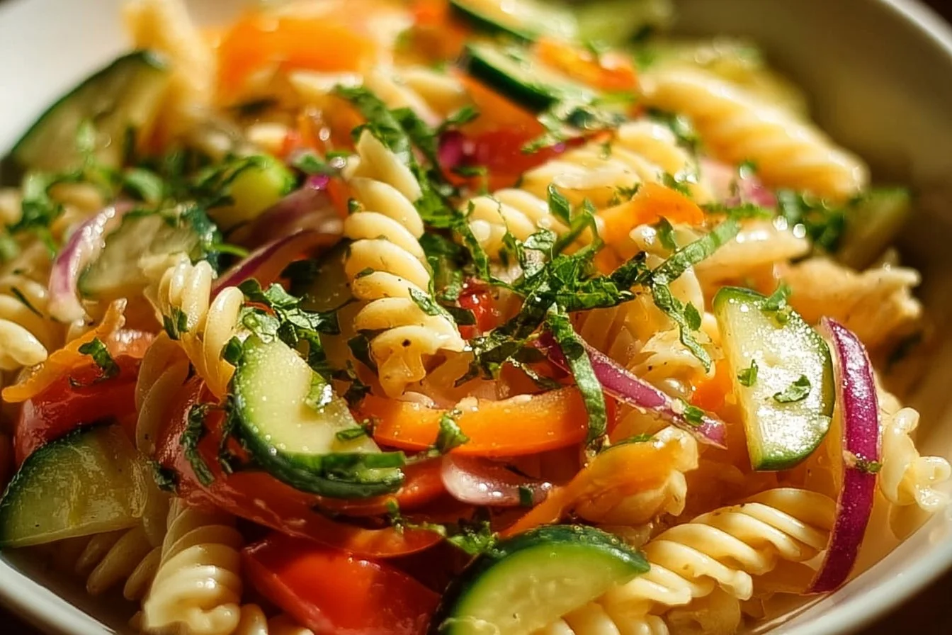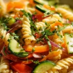 A delightful dish combining vibrant vegetables and perfectly cooked pasta for a fresh, colorful meal.